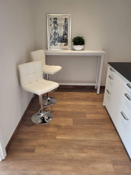 Der Fußboden ist mit langen Fliesen in Holzoptik ausgelegt und besitzt eine Trittschallstärke von 4 Feinstaub: selbst High Heels, Rollstühle, Kinderwagen machen ihm nix.
